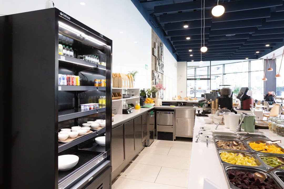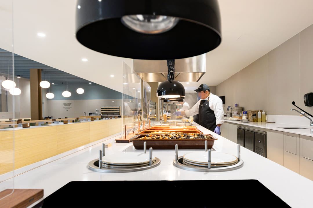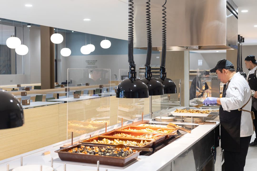 Se ha desarrollado un comedor de personal con capacidad para 150 pax en una superficie de 260 m², presidido por un lineal de show cooking de 13 metros que se convierte en el eje central del servicio. El espacio se ha planteado para favorecer una experiencia más dinámica, ordenada y eficiente, adaptada al funcionamiento cotidiano de un entorno corporativo.